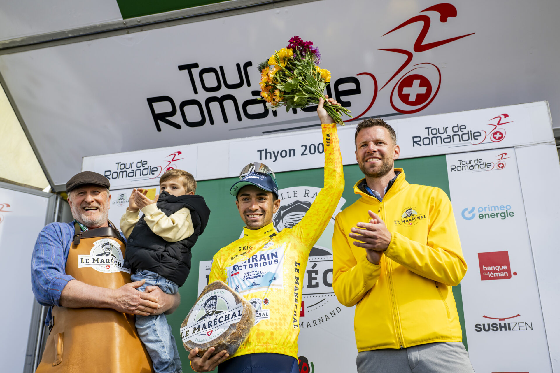 Remise du prix du meilleur jeune, Ethan Vernon de l’équipe Soudal Quick-Step, lors de l’étape 3 du Tour de Romandie 2023
